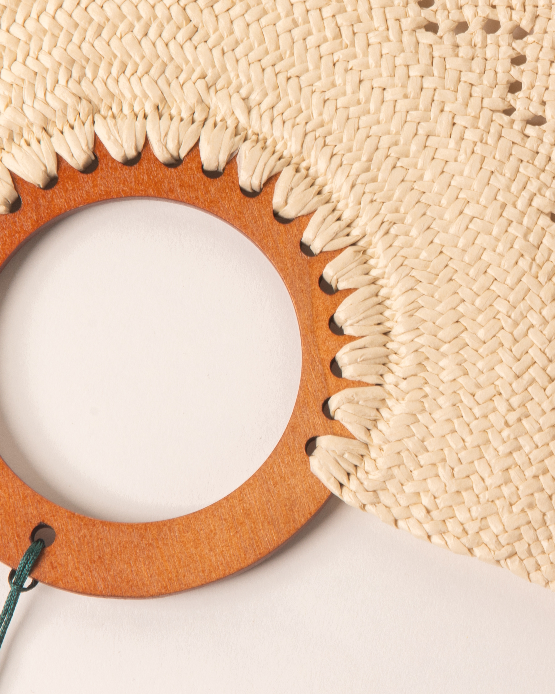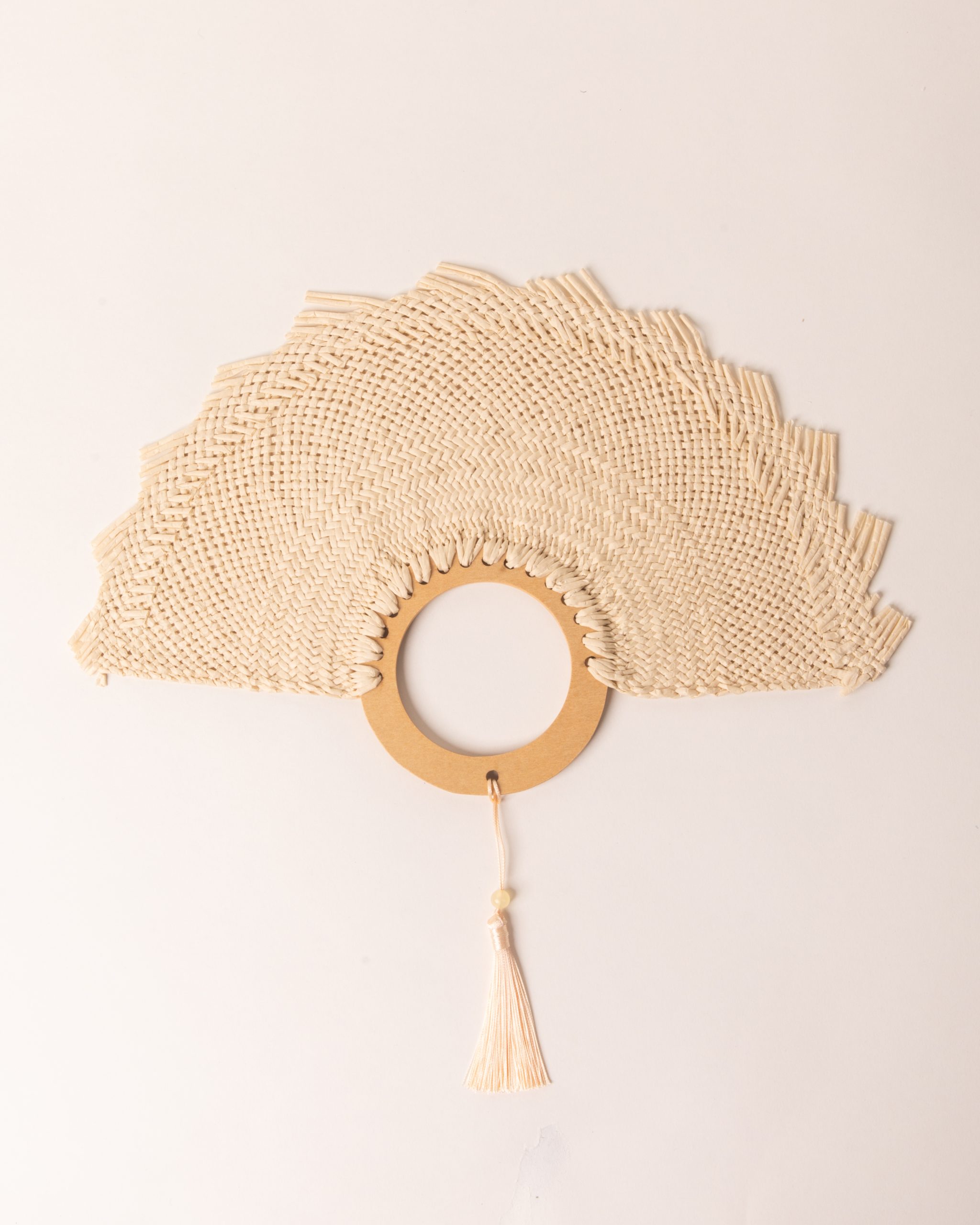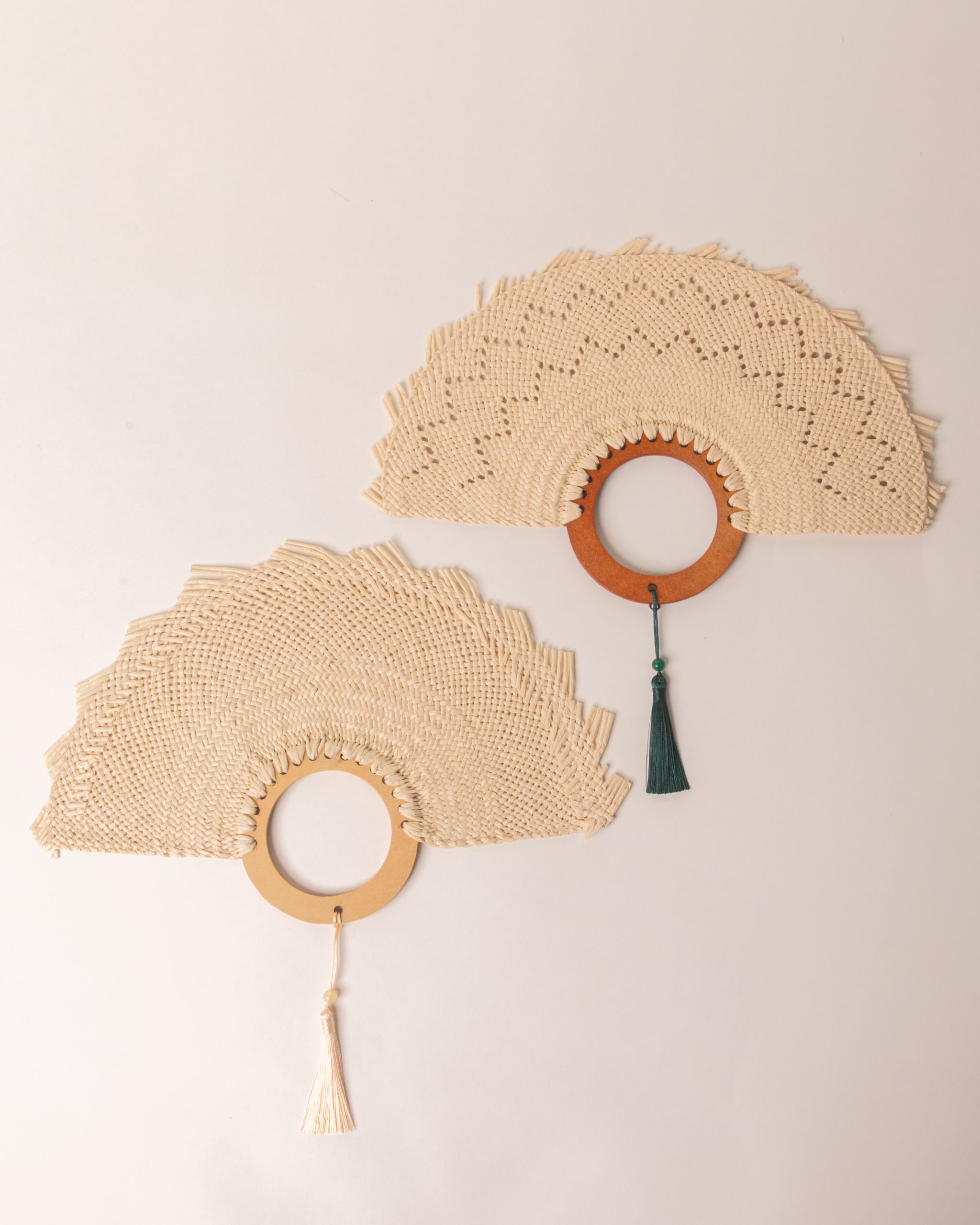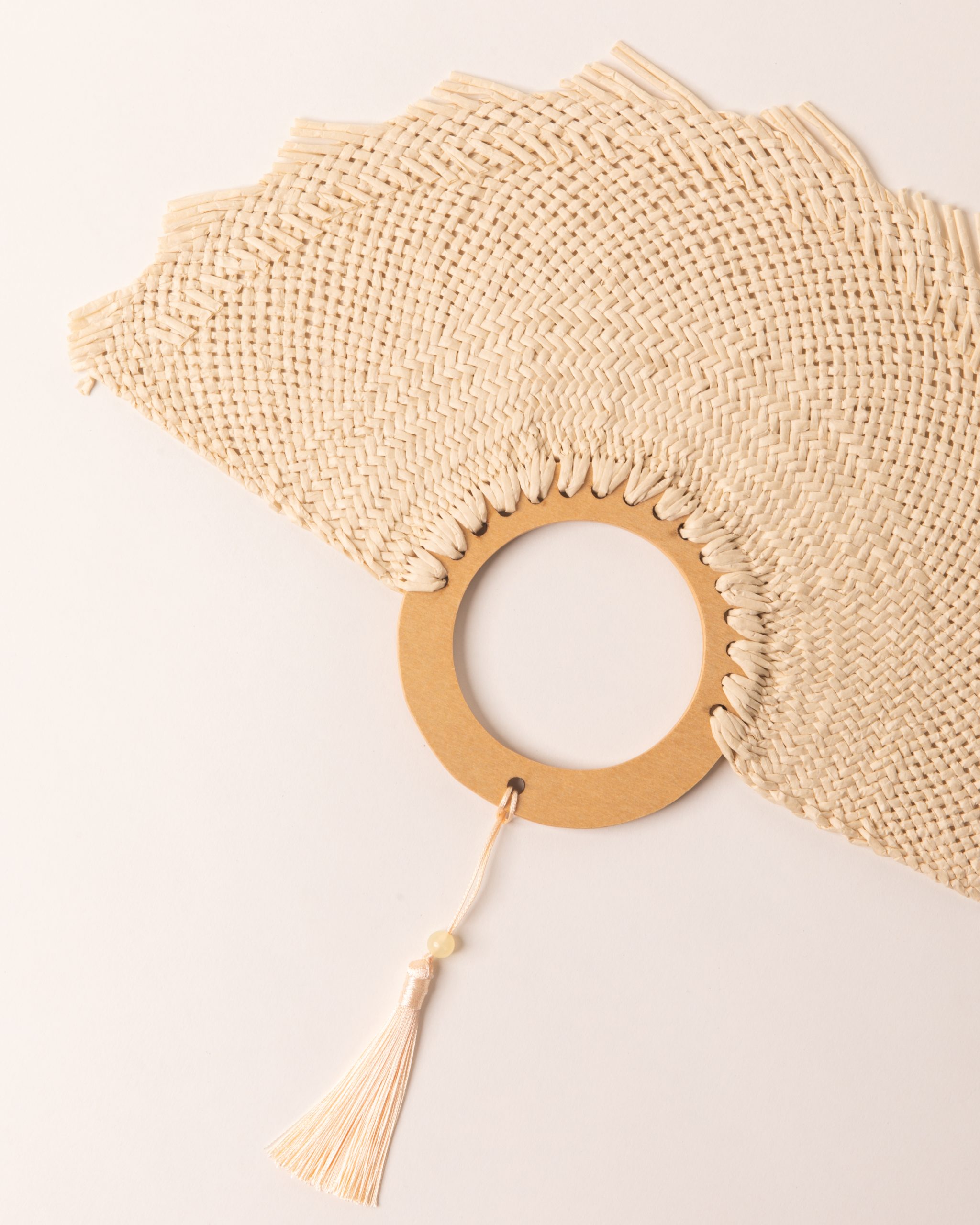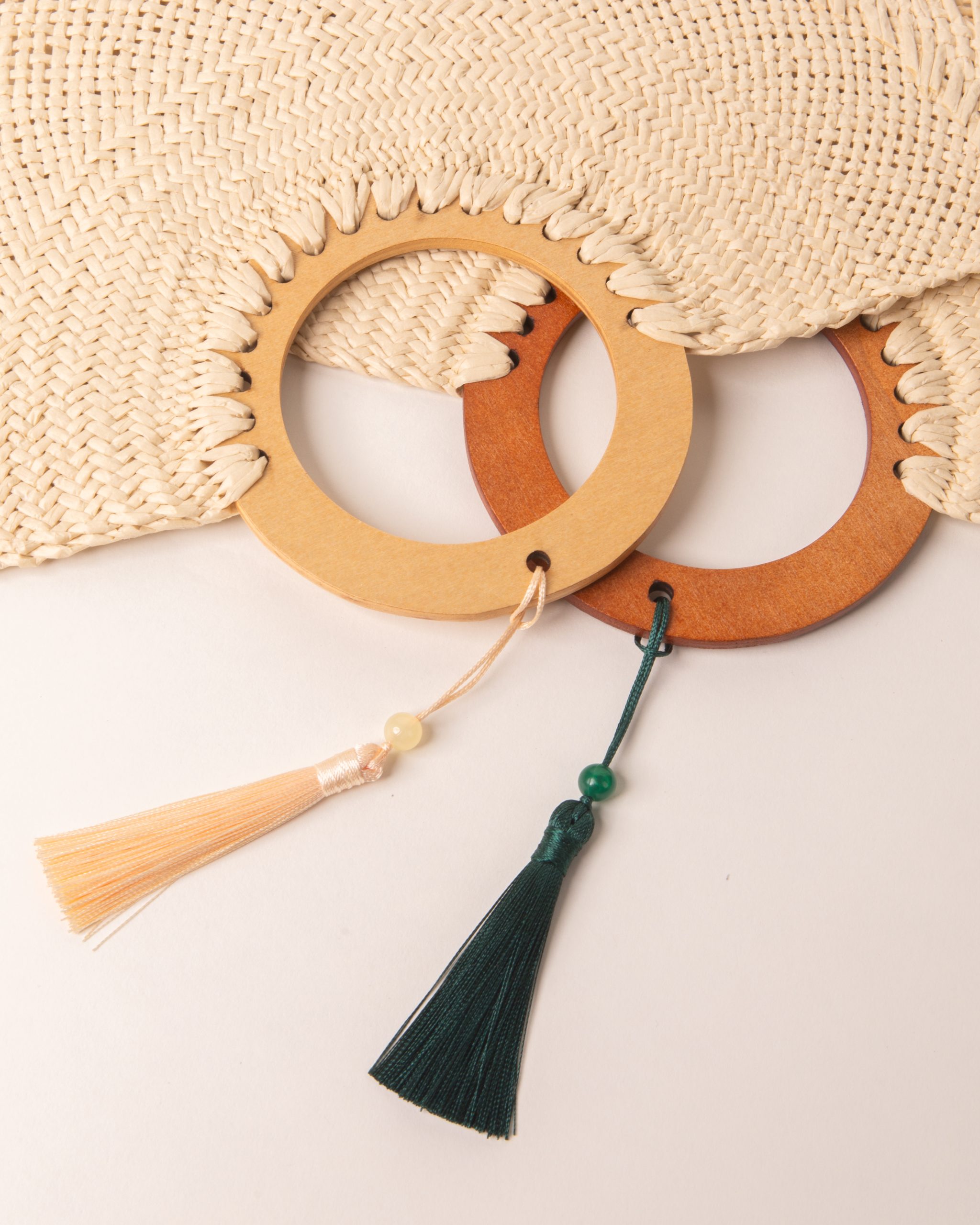 - Abanico tejido con mango de madera y borla de diferentes colores