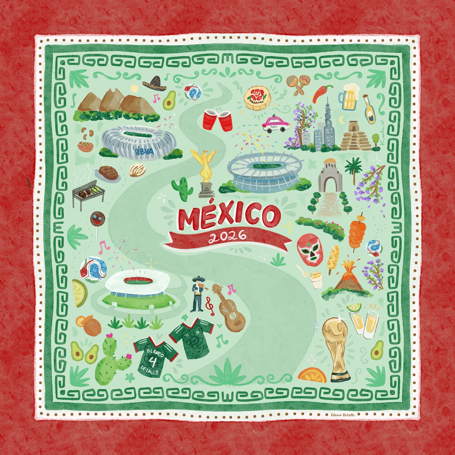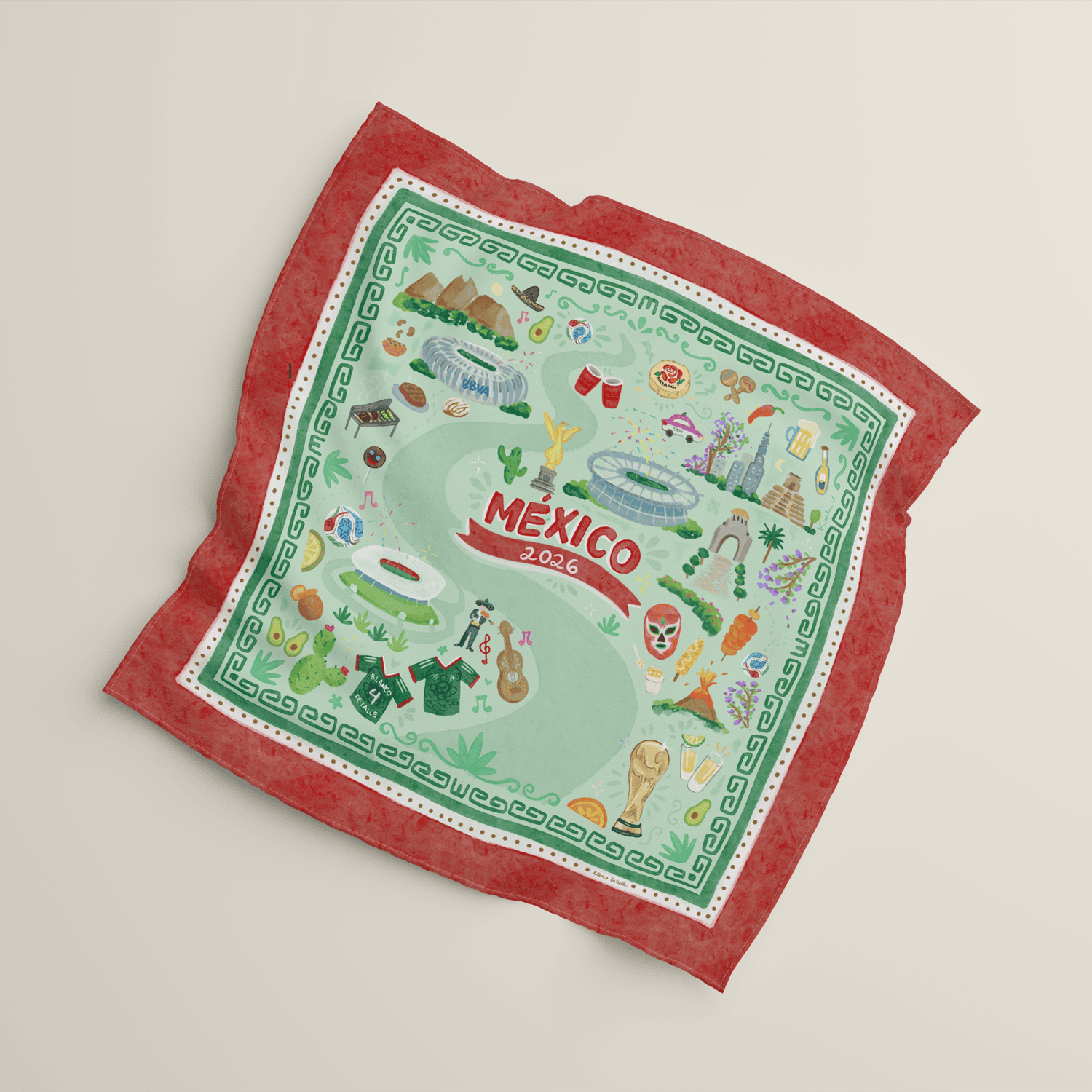 Perfecta para estadios, viajes mundialistas o ver el partido con amigos Una pieza ligera, versátil y llena de espíritu de afición que puedes usar en la cabeza,en tu bolsa,  al cuello o al agitar en el aire cuando caiga el gol. Características Medida 70×70 Material: Seda